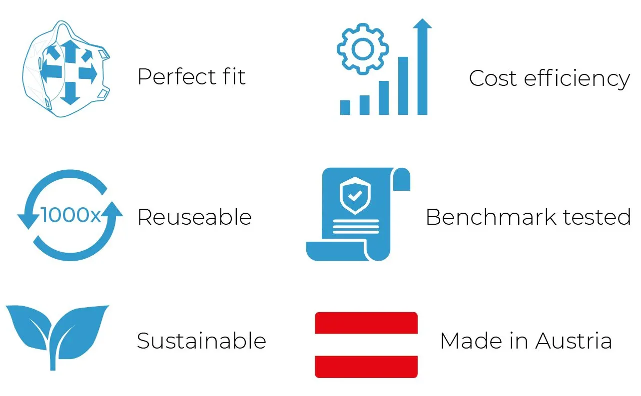 Mit der Unterstützung des Verteidigungsministeriums und ExpertInnen aus dem Lehrkörper der Universität Linz ist es uns gelungen, mit der AirCare+ Maske ein effizientes und stets verfügbares Hochleistungsprodukt zu entwickeln und auf den Markt gebracht.
